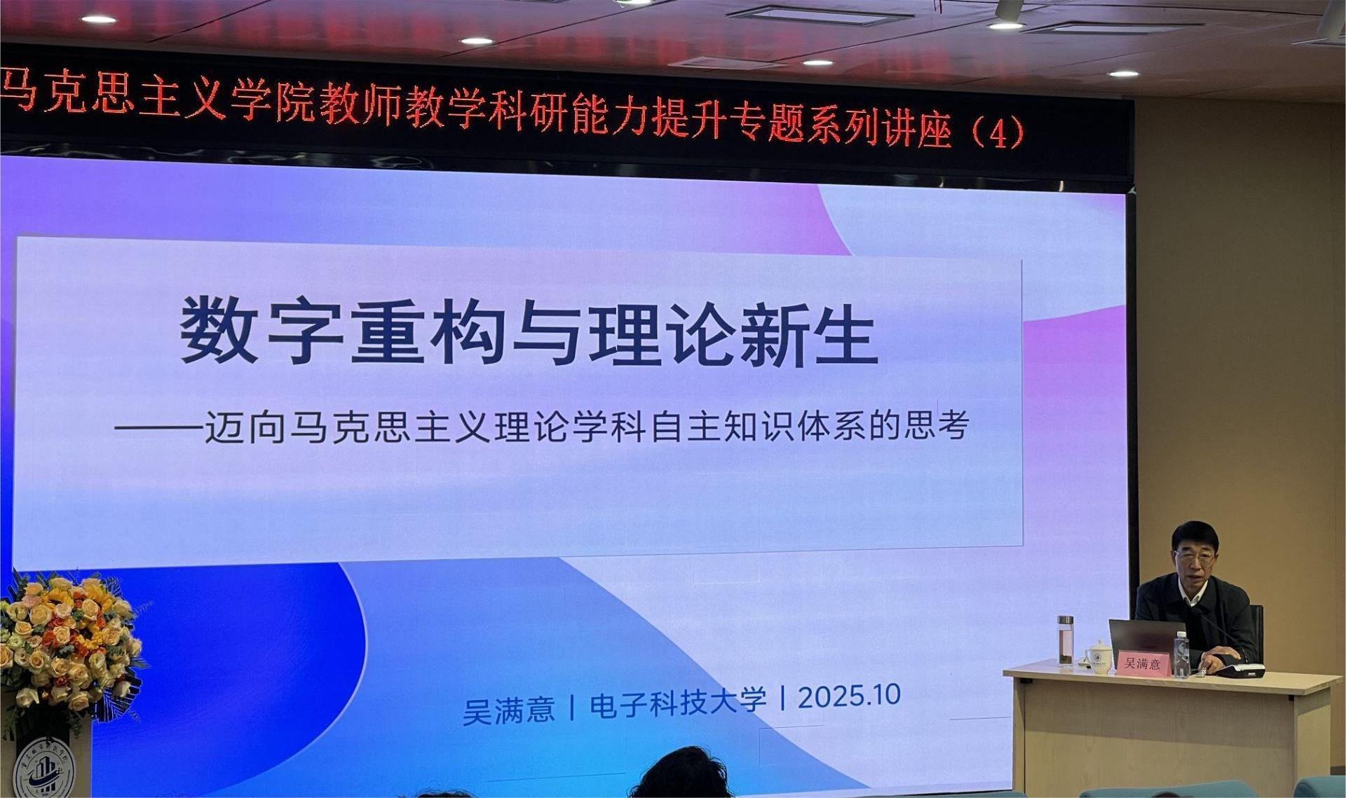 为了落实贯彻教育部《思想政治理论课课堂教学提升行动》和学校科研工作部署,助力数字赋能思政课教学,提升教师科研创新能力,10月29日下午,马克思主义学院在第二报告厅成功举办了第四场“教师科研能力提升专题讲座”。本场讲座的嘉宾是国家级高层次领军人才、四川省学术和技术带头人、教育部全国高校思政课名师工作室(电子科技大学)首席教授、四川省社会科学高水平研究团队负责人、四川省名师工作室负责人、电子科技大学马克思主义学院院长、博士生导师吴满意教授。马克思主义学院全体教师现场聆听了本次讲座。讲座由段吉福院长主持