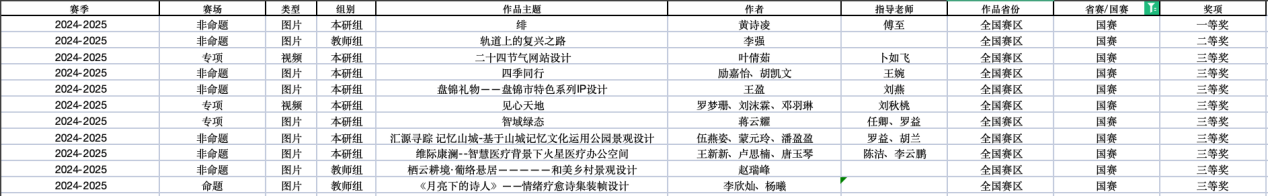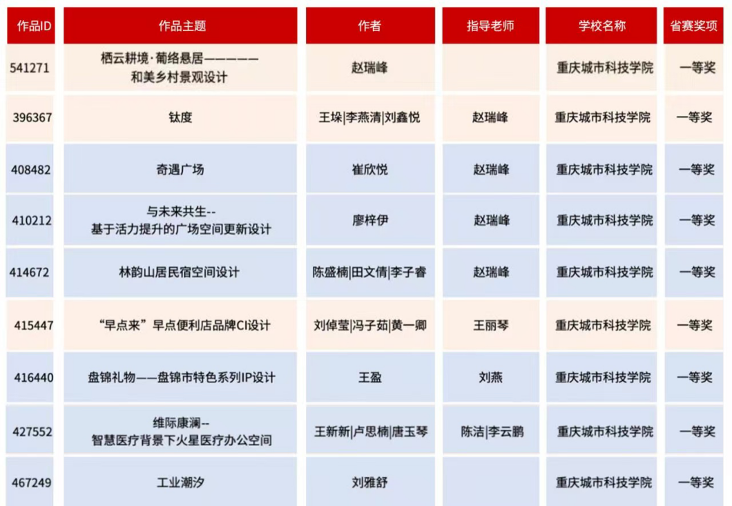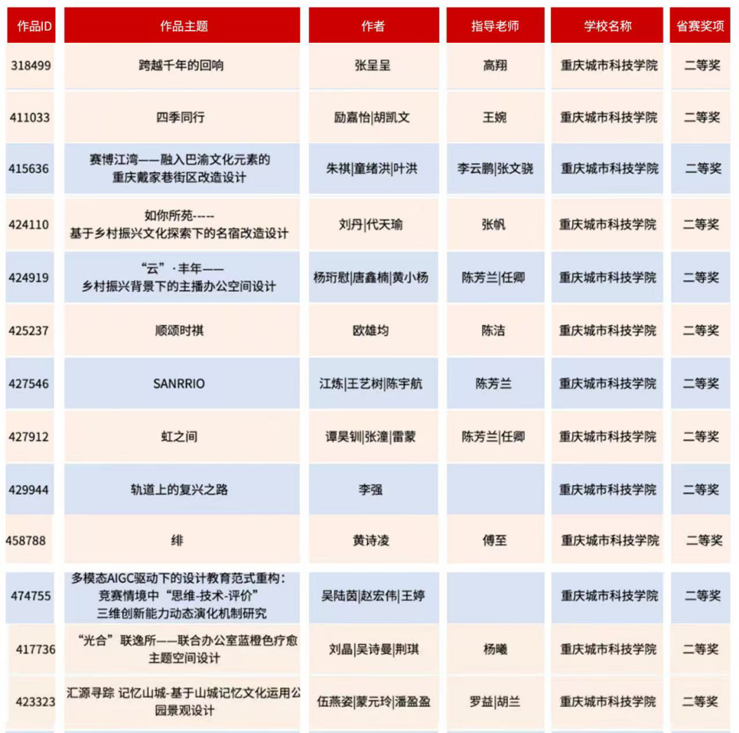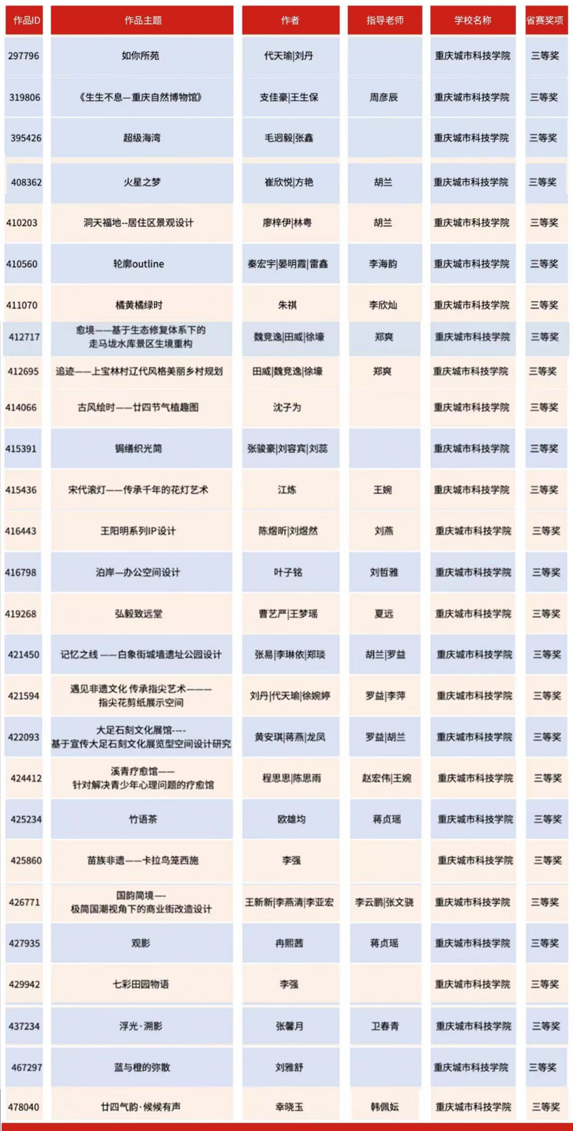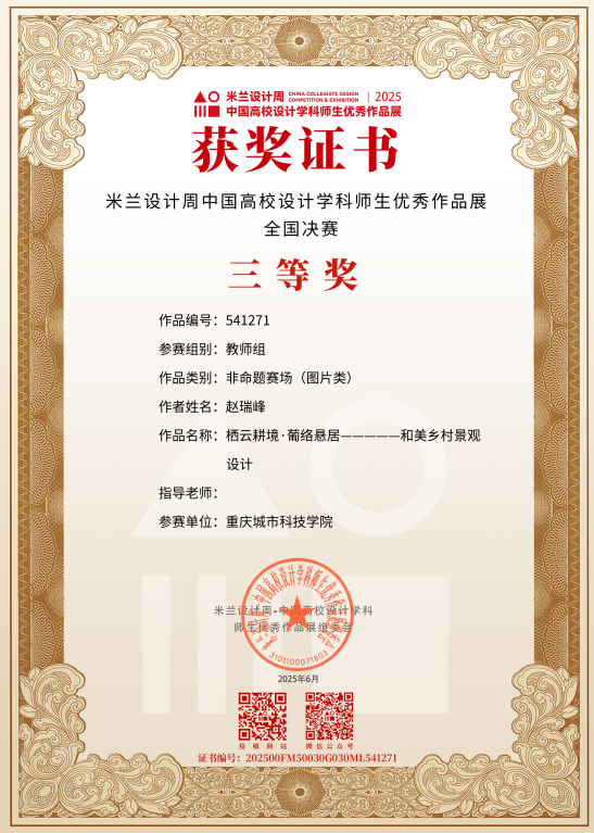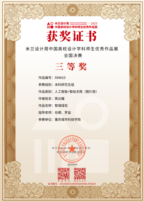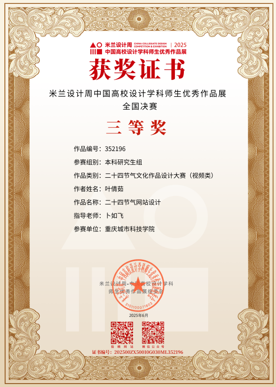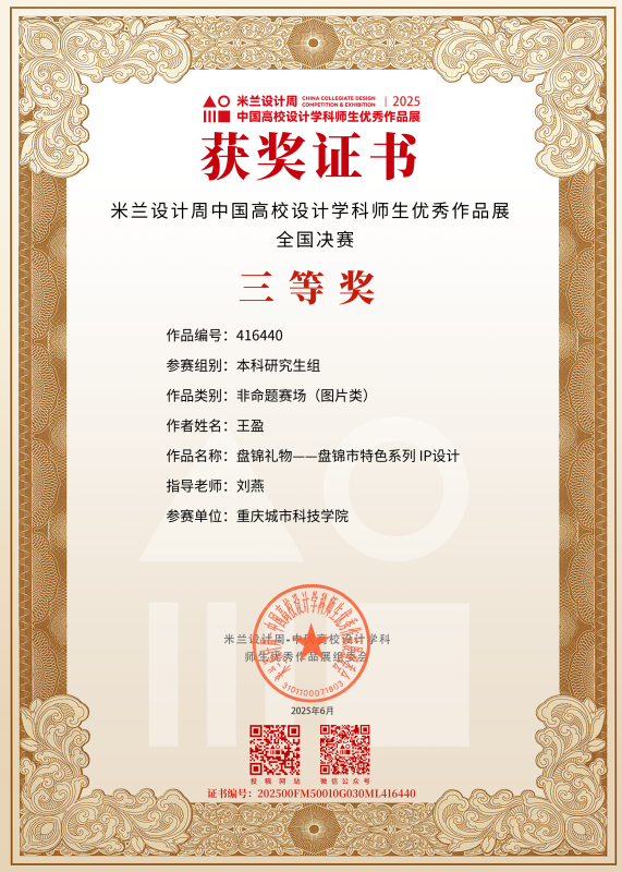 近日,教育部白名单赛事“米兰设计周(第九届)-中国高校设计学科师生优秀作品展”全国总决赛获奖名单正式公布。beat365英国官方网站艺术与传媒学院师生作品经过校级选拔、市级评审,最终在全国总决赛的激烈角逐中脱颖而出,共斩获奖项11项,其中,全国总决赛一等奖1项、二等奖1项、三等奖9项。在重庆赛区获奖49项,荣获省赛一等奖9项、二等奖13项、三等奖27项。国赛、市赛获奖总数及获奖等级均创历年新高。 赛事简介 米兰设计周-中国高校设计学科师生优秀作品展 (Milan Design Week China Collegiate Design Competition & Exhibition) 是由中国教育国际交流协会、中国高等教育学会于2016至2019年期间联合发起并主办的中国高校设计创新实践大赛暨米兰作品展系列活动。赛事旨在真实反映新时代背景下我国设计学科教学水平的现状和教学成果,为全国艺术学科师生搭建展示专业才华和创作水平的国际化交流学习平台。赛事迄今已成功举办8届,总计收到全国1300多所高校师生报名作品38万余件,其中在米兰展出优秀作品1400余件,有效支持国内外院校共享和对比教学成果,积极推动我国高等艺术教育的交流与进步。 国赛获奖名单 重庆赛区获奖名单(下滑) 全国一等奖获奖作品展示 作者姓名:黄诗凌 作品名称:《绯》 指导老师:傅至 全国三等奖获奖作品展示(部分) 作者姓名:王盈 作品名称:盘锦礼物——盘锦市特色系列IP设计 指导老师:刘燕 作者姓名:叶倩茹 作品名称:二十四节气网站设计 指导老师:卜如飞 作者姓名:伍燕姿、蒙元玲、潘盈盈 作品名称:汇源寻踪 记忆山城-基于山城记忆文化运用公园景观设计 指导老师:罗益、胡兰 作者姓名:王新新、卢思楠、唐玉琴 作品名称:维际康澜--智慧医疗背景下火星医疗办公空间 指导老师:陈洁、李云鹏 国赛获奖证书展示 此次丰硕的获奖成果,不仅是对beat365英国官方网站学子专业水平与创新能力的充分认可,也是beat365英国官方网站坚持“以赛促学、以赛促教”育人理念,持续优化学科布局、深化实践教学改革的生动体现。展望未来,beat365英国官方网站将进一步推动教育教学与前沿技术融合发展,拓展高水平竞赛与创新实践平台,强化学生专业能力与综合素养的协同提升,努力培养更多具备扎实功底、创新意识和跨学科视野的高素质设计人才。(许睿/图 许睿/文 传媒中心 易雪/编辑) 图/文 许睿