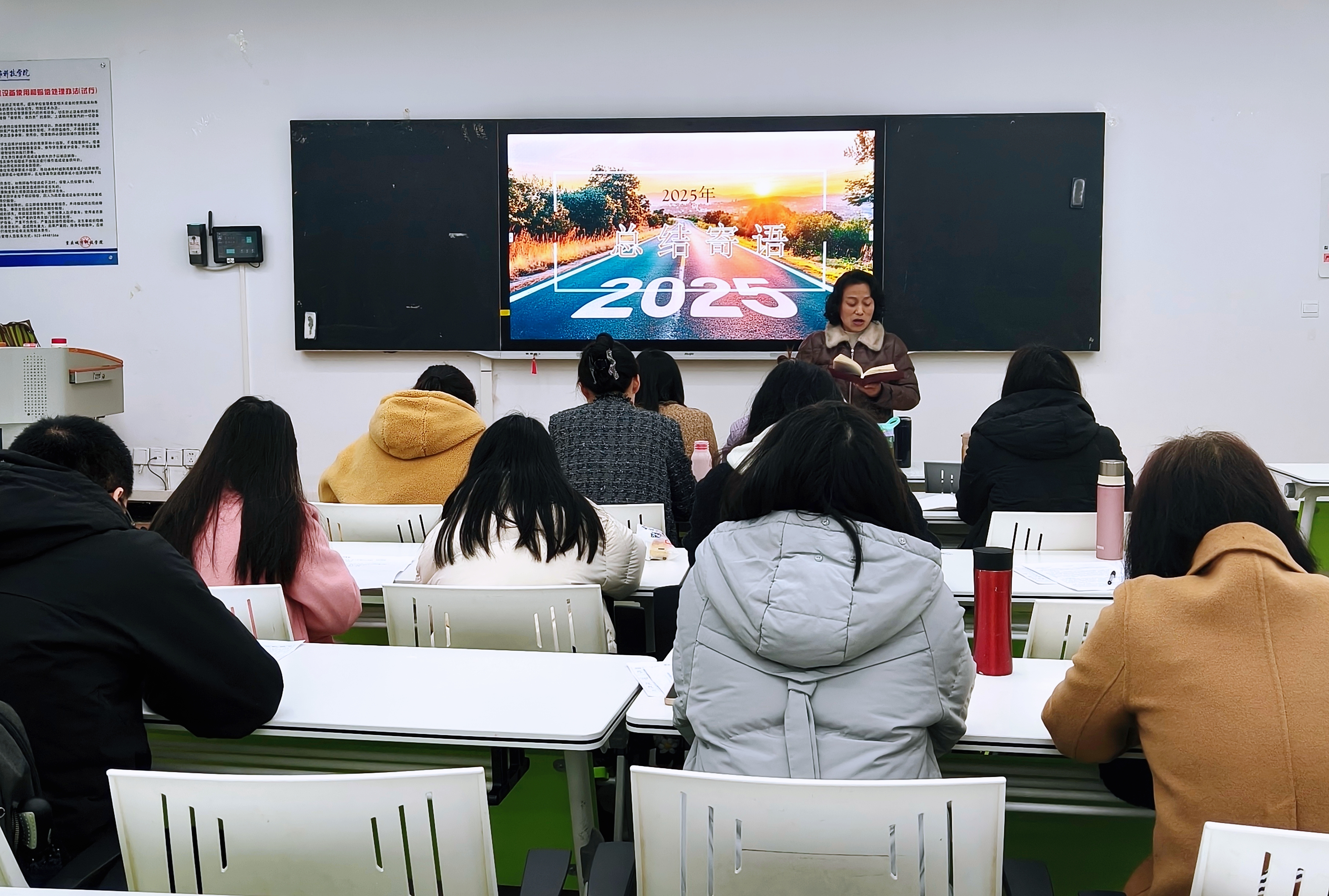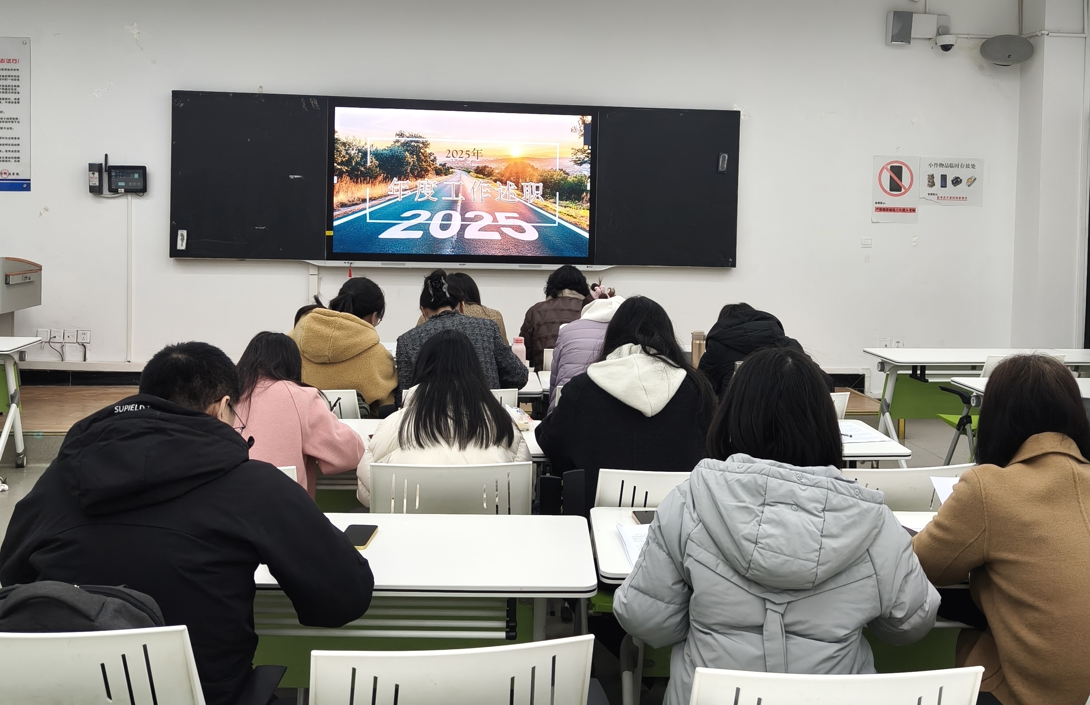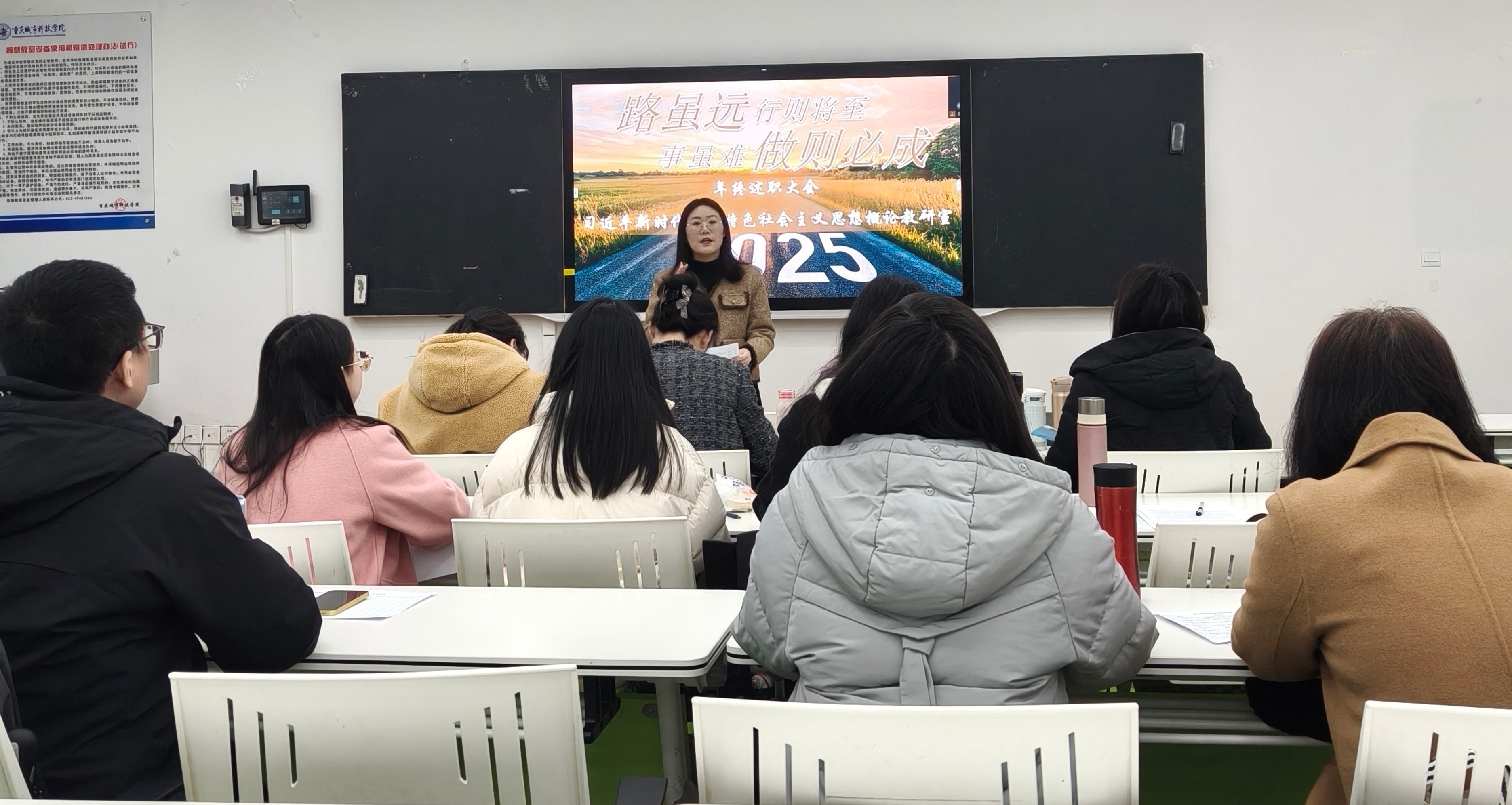 知往鉴来,行稳致远。2015年12月17日,马克思主义学院习近平新时代中国特色社会主义思想概论教研室在主教215教室开展2025年度述职会议。本次会议由教研室副主任成丽主持,教研室主任及全体教师参与本次会议。会议旨在总结2025年、展望2026年,凝聚团队力量,共同提升思政育人实效。 图一 教研室全体教师秉持实事求是、突出重点、紧抓亮点汇报原则,围绕本年度教学工作、科研成长、论文发表、教学竞赛、学院建设参与情况、个人成长与不足、下一年工作与成长规划等方面进行了总结汇报。 图二 在教学方面,多位教师承担《习近平新时代中国特色社会主义思想概论》《毛泽东思想和中国特色社会主义理论体系》《思想道德与法治》《中国近现代史纲要》等核心课程,注重课堂创新,通过案例教学、实践作业、考研衔接等方式提升教学吸引力,全年教学运行平稳有序。科研方面,部分教师积极参与课题申报、论文撰写与教学案例开发,部分教师获市级、校级奖项。在招生、党建、督导、学生竞赛指导等事务中,教师们全面投入,展现出高度的敬业和责任。多位教师在述职中反思自身不足,普遍提到科研深度、教学创新及参赛韧性等方面仍需提升,表达了下一年度深耕教学、加强科研的决心和力度。 图三图四 会议最后,教研室主任陈胜婷以“深、全、竞”三字对全年工作作了整体总结:一是教师深耕教学、融合科研,课堂扎实、效果显著;二是全面参与学校各项事务,展现多重角色担当;三是在各类竞赛中积极进取、屡获佳绩。她充分肯定了教研室团队的凝聚力与教师们的辛勤付出,同时强调期末阶段更应严守教学纪律,“站好最后一班岗”,以持续力推动教研室工作迈向平稳提质新阶段。 图五 此次述职会议在务实、团结的氛围中圆满结束,不仅是对过去一年工作的系统回顾与反思,更是为新一年的工作指明了方向、凝聚了共识。全体教师将以此次会议为新的起点,继续保持育人初心,增强团队协作,在教学、科研与育人实践中不断开拓进取,共同谱写思政育人新篇章。