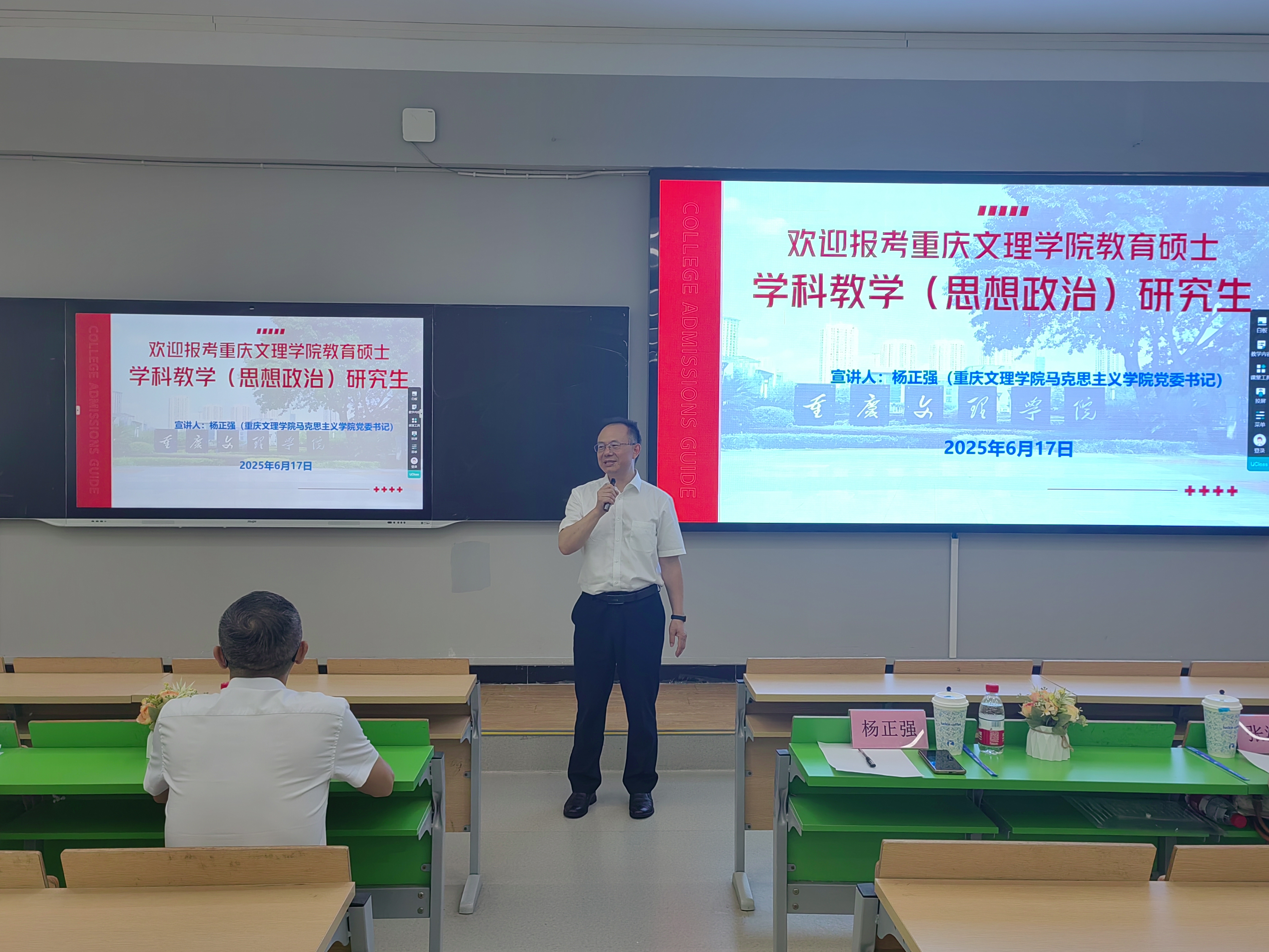 为深化校际合作,助力学子规划深造路径,2025 年 6 月 17 日,马克思主义学院在主教 311 会议室举办思想政治教育专业考研宣讲会。重庆文理学院马克思主义学院党委书记杨正强受邀担任主讲嘉宾,马克思主义学院院长段吉福、副院长张沙沙、思政系主任柳建国、副主任张峻铭,及重庆文理学院马克思主义学院学工办主任、团委书记张海鹰出席会议。23 级思政 1-3 班与 24 级思政专升本 1 班学生现场聆听。 杨正强书记在宣讲中全面介绍重庆文理学院及马克思主义学院整体情况,重点围绕马克思主义学院学科教学(思想政治)专业硕士方向的设置背景、专业特色、师资配置及就业前景展开详解,并从考研报考流程、备考注意事项等维度为学生提供清晰指导。 针对学生关切的考研热点问题,杨正强书记逐一耐心解答。张沙沙副院长在总结中表示,本次宣讲会为学生搭建了了解考研信息、规划深造路线的优质平台。学院将持续深化校际合作,整合优质教育资源,助力更多学生实现深造梦想,推动高质量就业。 此次宣讲会通过校际联动与专业解读,为学生提供了兼具针对性与实用性的考研指引,进一步拓宽了人才培养与发展的合作渠道。(马克思主义学院/图 马克思主义学院/文 陈梦玲/编辑)
