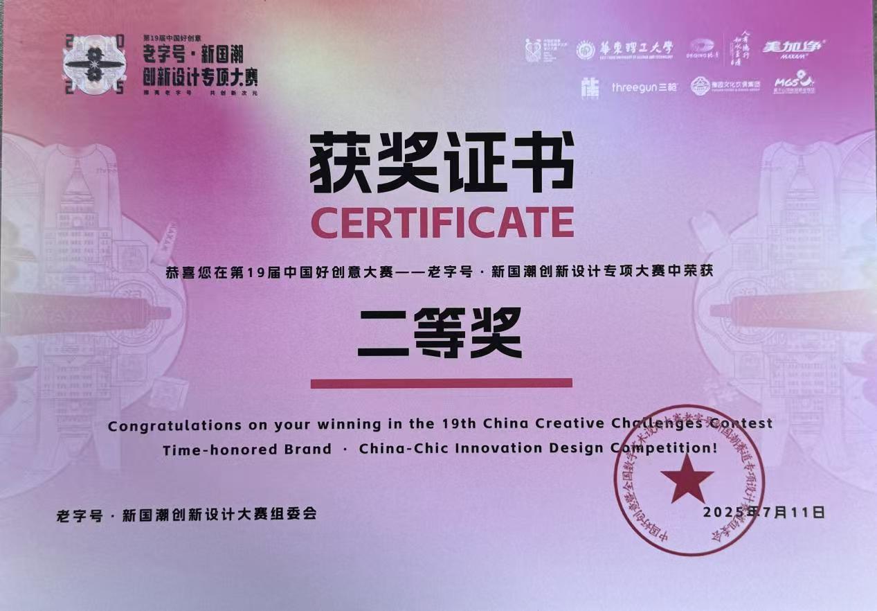 7月9日—11日,第19届“中国好创意暨全国数字艺术设计大赛——老字号·新国潮”专项赛在浙江省德清县莫干山火热举行,比赛分24小时训练营、现场决赛答辩和颁奖典礼三个部分。经过与全国百余所高校263支入围团队同场竞技,我校艺术与传媒学院视觉传达设计专业学生邓力瑗斩获国赛二等奖,指导老师龚洁获评“优秀指导老师”称号。 参赛师生及获奖证书 第19届中国好创意-老字号·新国潮创新设计专项赛24H训练营,由华东理工大学艺术设计与传媒学院教授倪海郡老师主持。他结合自身在老字号品牌焕新领域的丰富经验,为学员们描绘了新时代背景下老字号创新发展的广阔图景,点燃了在场每一位青年设计师的创作激情与使命担当。 新国潮创新设计专项赛24小时训练营开营仪式 24小时训练营现场(邓力瑗) 在训练营导师们专业严谨的指导下,来自世界各地百余所高校的选手们在视觉表现和设计美感上实现飞跃,在文化内涵的深度挖掘上获得提升,在市场需求以及创意维度的精准把握上取得突破,展现青年学子的学习力和创新潜力。本次训练营不仅是一次设计技能的飞跃式提升,更是一次深刻的文化寻根之旅,激发了选手们对中华传统文化传承创新的责任感。 邓力瑗答辩现场 决赛答辩现场,邓力瑗与各参赛团队同台展示。其作品《美加净上海礼盒包装设计》,巧妙融合了老字号品牌文化底蕴与年轻化视觉语言。面对评委对设计创意、文化内涵及市场可行性的多维考核,她沉着应对,以清晰的逻辑和自信的陈述,层层突破初评、复评与终评答辩,赢得评委高度认可,斩获国赛二等奖。 现场领奖照片 在颁奖典礼上,邓力瑗同学作为获奖选手登台领奖,龚洁作为教师代表,上台接受“优秀指导教师”表彰,师生同台,共享荣耀时刻。本次获奖不仅是对邓力瑗同学专业能力的肯定,更是我校“以赛促教、产教融合”教学成果的生动体现。未来,艺术与传媒学院师生将继续在传承、弘扬中华文化的道路上砥砺前行,展现青春创意力量,以设计点亮新国潮!(传媒中心 徐安妮/编辑)