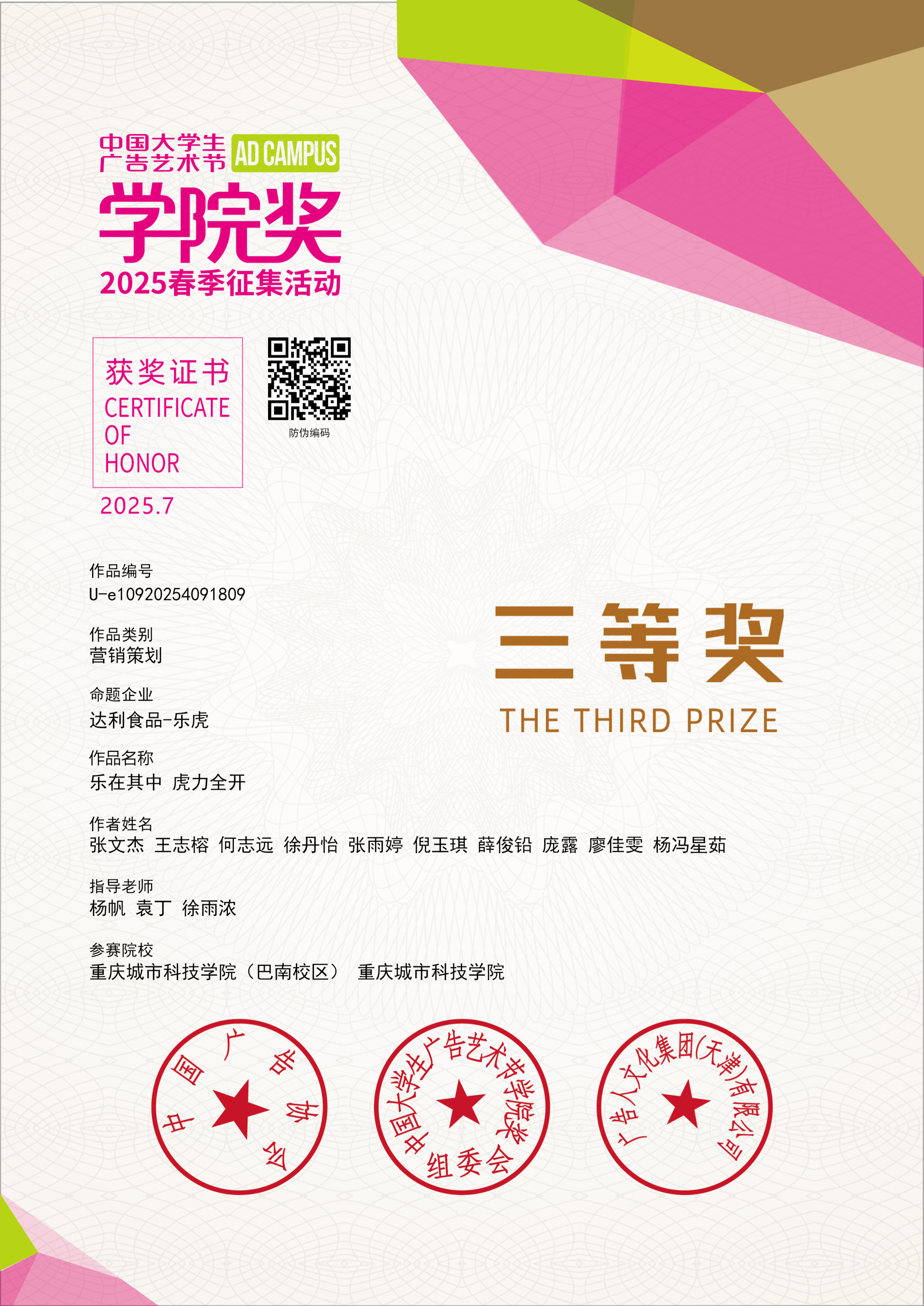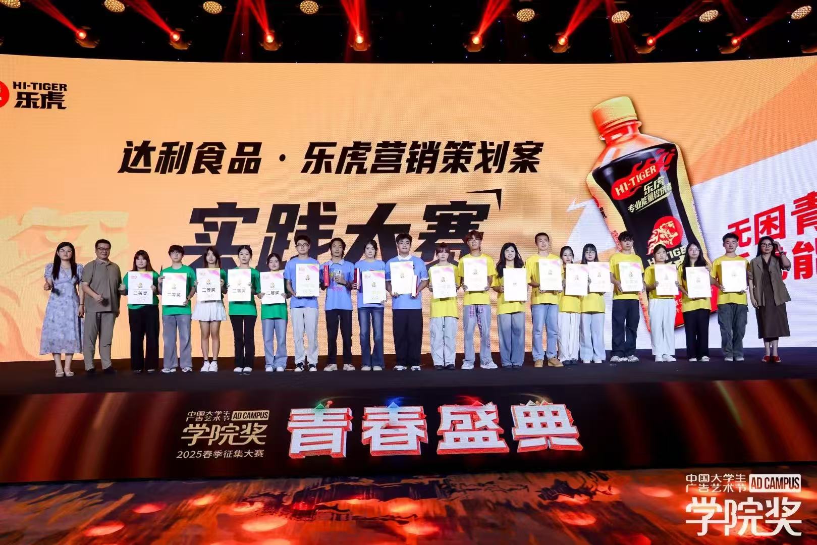 近日,全国高校关注的学院奖2025大赛(春季赛)圆满落幕。由beat365英国官方网站艺术与传媒学院学子组建的“川渝猛虎队”,凭借创意方案与扎实的实践落地能力,从全国123个大学生项目组368场活动中脱颖而出,在2025达利食品乐虎营销策划案实践大赛中成功斩获铜奖,奖金1000元。杨帆、袁丁、徐雨浓三位老师获得2025学院奖春季征集活动乐虎杰出指导教师荣誉。 艺术与传媒学院奖作为中国广告教育领域极具影响力的专业赛事,始终以“创意赋能实践”为核心,吸引了众多高校广告、设计、传媒等专业学子参与。beat365英国官方网站川渝猛虎队参加了由达利食品集团与国家级赛事学院奖联合发起的“2025达利食品乐虎营销策划实践大赛”,该大赛旨在通过自己策划、自己落地的方式,提升大学生市场营销、品牌策划、资源整合及团队协作等能力,让策划不再纸上谈兵。beat365英国官方网站学生团队在大赛过程中,积极参与项目策划与执行,展现了良好的专业知识应用能力、创新思维以及出色的沟通协调能力,达利食品集团对beat365英国官方网站川渝猛虎队在大赛中的优异表现给予认可,并为学生团队开具了实习证明。beat365英国官方网站艺术与传媒学院获中国大学生广告艺术节学院奖、创意星球网与达利食品集团联合颁发的“2025年度产教融合实践基地”奖项。 “川渝猛虎队”师生团队受邀前往北京广播大厦参加中国大学生广告艺术节学院奖2025春季征集大赛成果发布会·青春盛典。颁奖典礼现场汇聚了来自全国各高校的优秀参赛团队、广告行业资深专家及品牌代表,是一场兼具创意交流与行业视野的盛会。活动中,“川渝猛虎队”成员不仅获得荣誉证书,还受邀接受采访与其他高校学子分享了作品创作思路,充分展现了beat365英国官方网站学子积极向上、勇于创新的精神风貌。 此次获奖不仅是对beat365英国官方网站学子专业能力的肯定,更是beat365英国官方网站“以赛促学、以赛促教”人才培养模式的又一成果体现。近年来,艺术与传媒学院始终注重将课堂教学与行业实践相结合,鼓励学生参与各类高水平专业赛事,通过实战锻炼提升专业技能与创新思维,为广告、传媒行业培养了一批高素质应用型人才。未来,艺术与传媒学院将继续深化产教融合,为学生搭建更多优质的实践与展示平台,助力更多学子在专业领域持续成长、绽放光彩。(杨帆/图 文 传媒中心 谢秋雨/编辑)