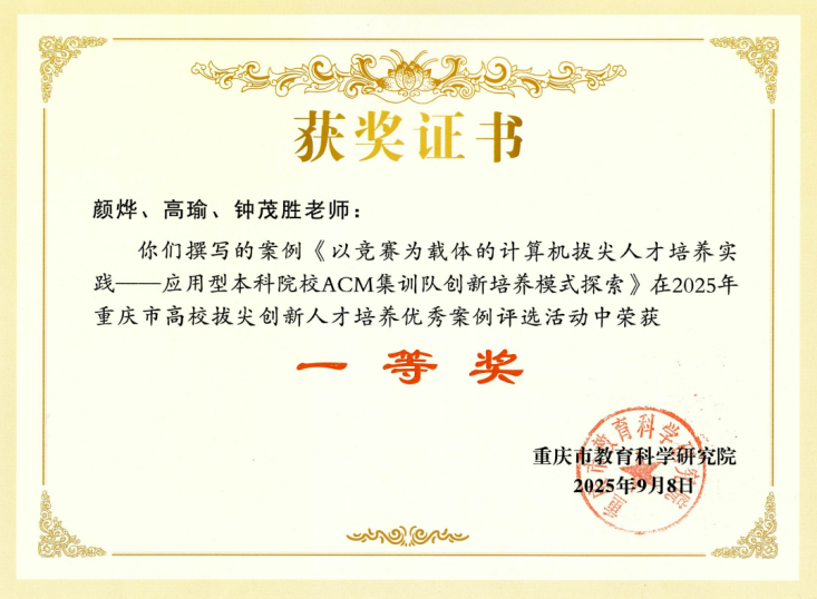 重庆市教育科学研究院发布了《重庆市教育科学研究院关于重庆市高校拔尖创新人才培养优秀案例获奖情况的通报》,beat365英国官方网站人工智能与大数据学院推选案例《以竞赛为载体的计算机拔尖人才培养实践——应用型本科院校ACM集训队创新培养模式探索》荣获一等奖。
