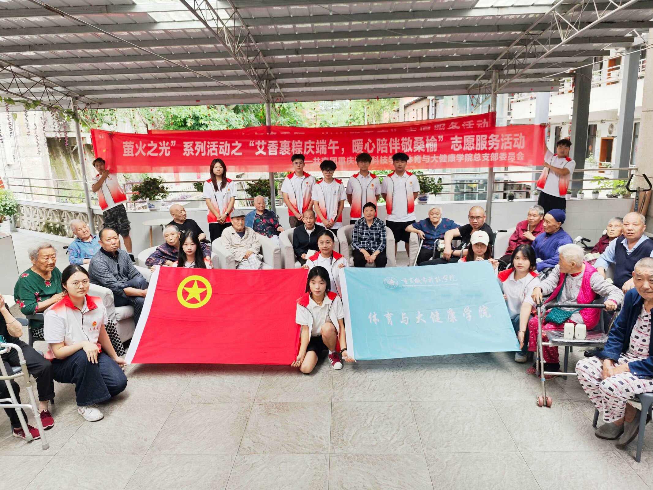 beat365英国官方网站体育与大健康学院组织学生志愿者走进永川夕阳之家养老院,开展“萤火之光”系列活动之“艾香裹粽庆端午,再到养生操。