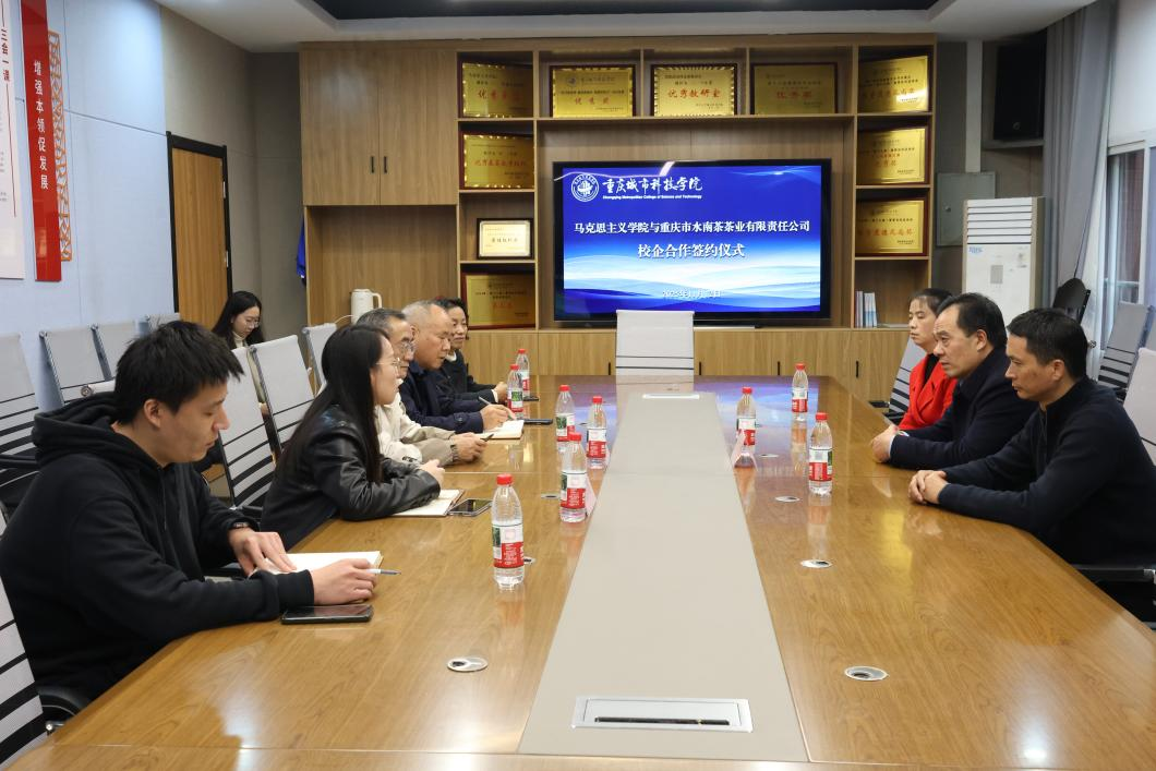 马克思主义学院与重庆市南水茶茶业有限责任公司于马克思主义学院会议室进行校企合作战略协议签约仪式,柳建国教授就合作达成后传统文化传承和永川茶叶文化发展在思政专业教育的想法和思路进行分享。
