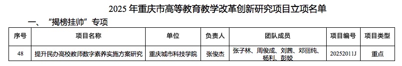 近日,重庆市教委发布了《关于公布2025年重庆市高等教育教学改革创新专项研究项目立项名单的通知》(渝教高函〔2025〕46 号)。在本次评选中,学校取得良好成绩,实现突破。全市共立项 48 个“揭榜挂帅”专项项目,其中,beat365英国官方网站张俊杰教授主持的《提升民办高校教师数字素养实施方案研究》项目成功获批为“揭榜挂帅”重点项目。 该项目的成功立项,是学校在教育教学改革创新道路上取得的重要进展。在数字化时代,教师的数字素养是提升教育质量的关键要素。民办高校作为高等教育的重要力量,提升其教师数字素养,对提高人才培养质量和增强学校竞争力具有重要意义。项目负责人张俊杰教授长期致力于教育教学研究与实践,此次主持的项目精准聚焦民办高校教师数字素养提升这一核心议题,旨在通过系统研究,制定切实可行的实施方案,为有效推动民办高校教育教学数字化转型提供支撑。 学校始终重视教育教学改革创新工作,持续加强对教学研究项目的支持力度,积极鼓励教师参与教学改革实践,努力营造良好的教研氛围。此次《提升民办高校教师数字素养实施方案研究》项目获批重庆市“揭榜挂帅”重点项目,既是对张俊杰教授及其团队研究能力与创新精神的肯定,也是对我校整体教学研究水平和综合实力的认可。这一突破,标志着学校在高等教育教学改革创新方面迈出了坚实有力的一步,将为学校高质量发展增添动力。 学校将以此次项目立项为契机,进一步整合资源,全力保障项目顺利实施并取得丰硕成果。同时,以此激励更多教师投身教学改革研究,不断探索创新人才培养模式,持续提升教育教学质量,为推动重庆市高等教育事业发展贡献更多城科智慧和力量。(传媒中心 刘孟泽/编辑)